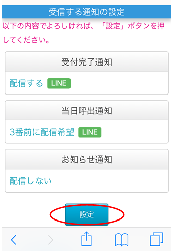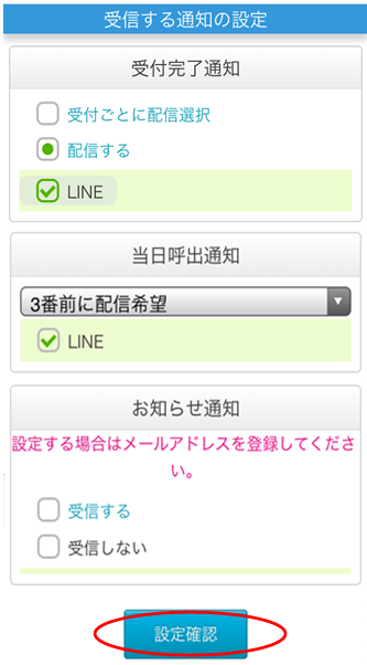 2.受付完了通知、当日呼出通知の設定を確認又は変更し、「設定確認」をクリックします。
